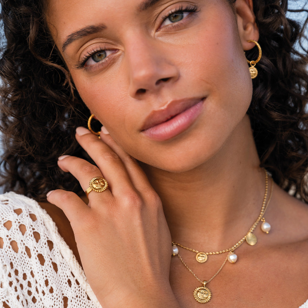 Inspired by the energy of the sun, the Apollo Collection captures the essence of light, warmth and celestial beauty. Featuring elegant sun motifs with sculptural detailing, each piece is a symbol of strength. Whether you choose the bold ring, delicate necklace, statement hoops, or classic studs, this collection brings a touch of mythology and playful elegance to your everyday look.