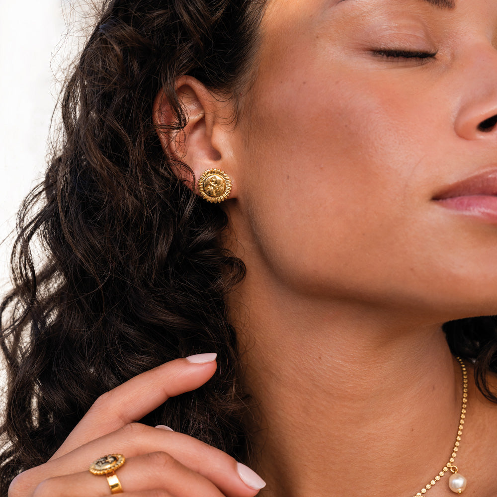 Inspired by the energy of the sun, the Apollo Collection captures the essence of light, warmth and celestial beauty. Featuring elegant sun motifs with sculptural detailing, each piece is a symbol of strength. Whether you choose the bold ring, delicate necklace, statement hoops, or classic studs, this collection brings a touch of mythology and playful elegance to your everyday look.
