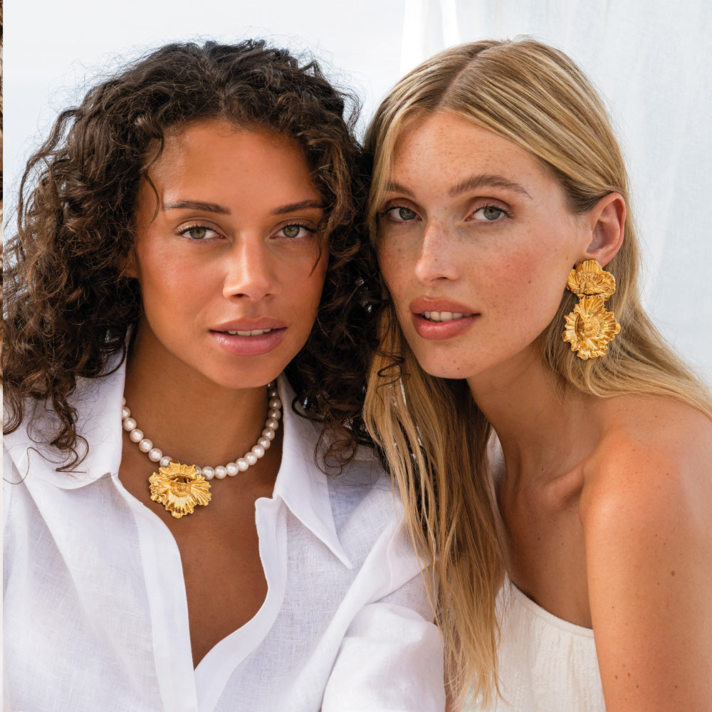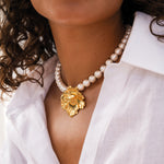 A modern take on classic elegance, the Bibi Pearl Choker blends lustrous pearls with a striking, sculpted floral centerpiece. This piece captures the essence of effortless glamor, making it the perfect accessory for sun-drenched escapes or elegant evening affairs.