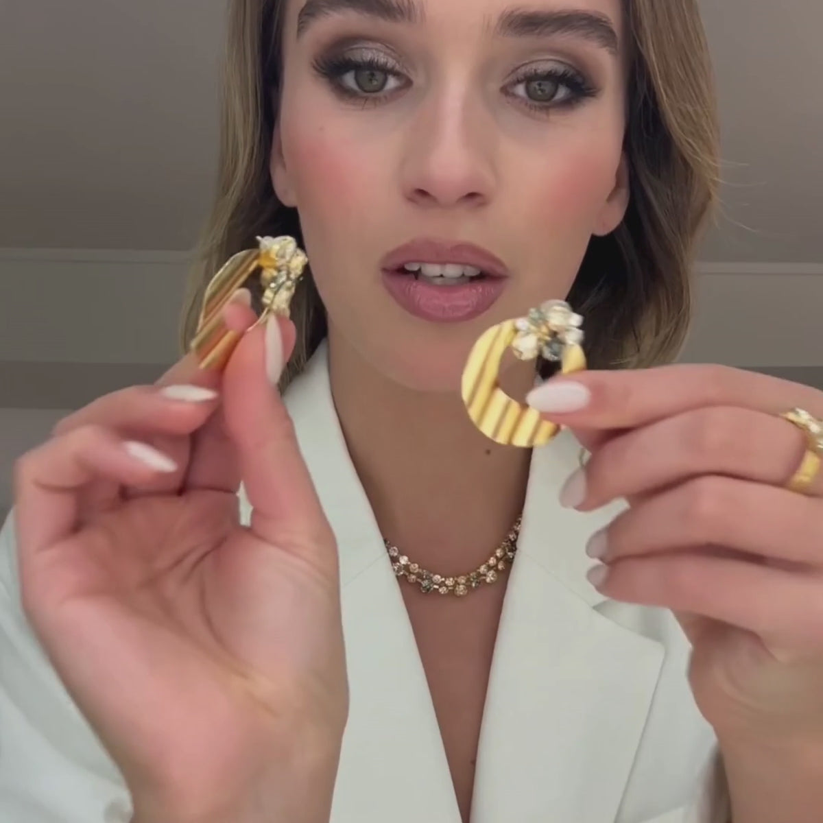 All jewelry is made of brass with 18-karat gold or rhodium plating and selectively chosen high-quality crystals. All jewelry complies with EU standards as nickel-safe/nickel-approved, meaning that the nickel content released is below the allowable threshold (0.05%). Nearly all metals contain some trace amounts of nickel, even if in extremely small quantities. The earring posts we use are made of 925 silver. All materials used in manufacturing are consistently tested for the highest quality.
