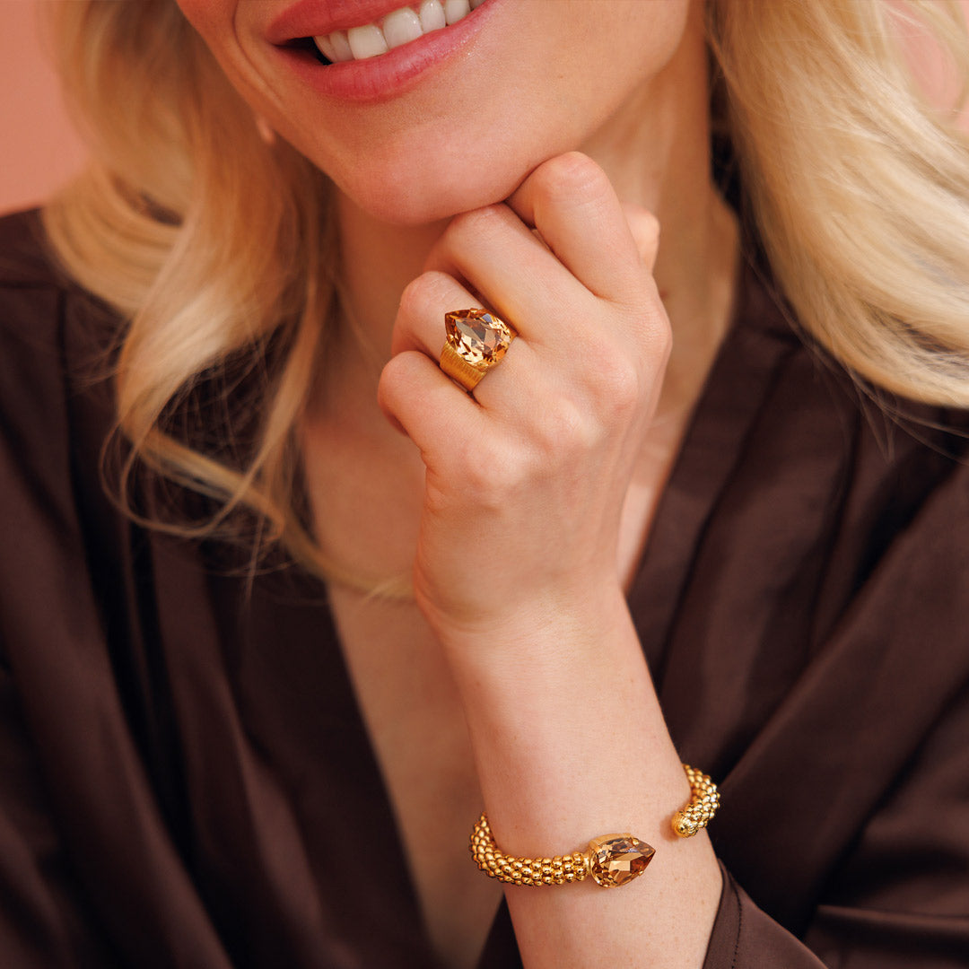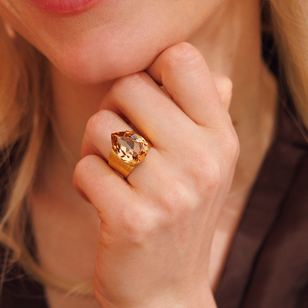 Our Classic Drop Ring comes with one beautiful drop shaped crystal from the world's highest quality crystals. The Ring is adjustable to fit perfectly on your finger and is made of gold plated brass.