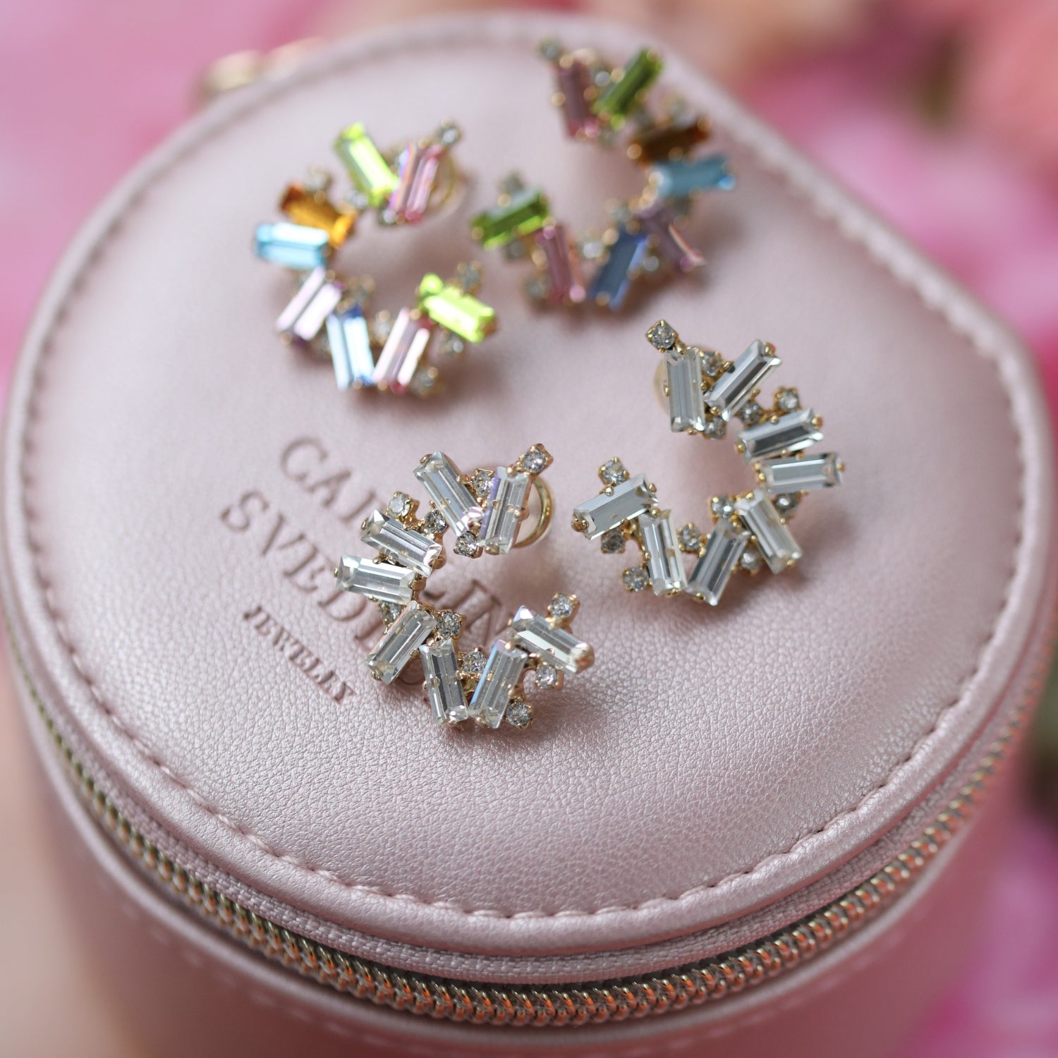 Perhaps this season's coolest earrings? Our fashionable Gina Earrings! The design features Baguette Crystals in different colours made of the highest quality. Hurry up and lay your hands on these beauties.