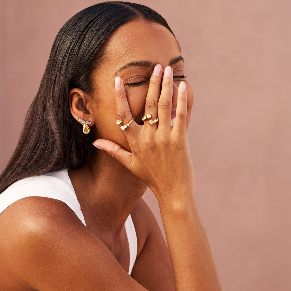 Let us introduce your new favorite - The Halo Ring! Its open design is set with shimmering crystals that wrap gracefully around the finger, creating a look that is both trendy and sophisticated. Effortlessly elegant on its own and just as beautiful stacked!