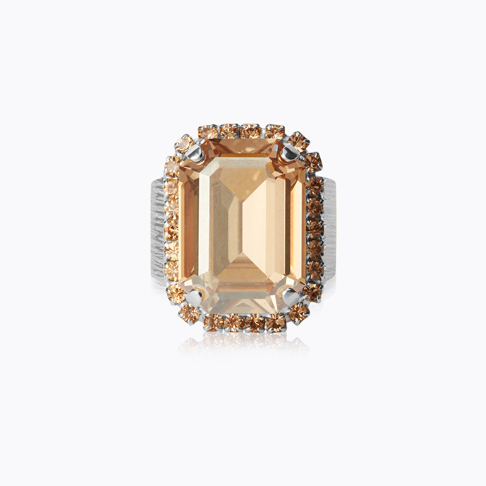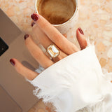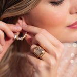 Our elegant Lydia Cocktail Ring evokes the glamour and romance of the 1920s. The design features a rectangular crystal in the middle, surrounded by smaller ones for a sophisticated appearance. Available in Golden Shadow and Mulberry Red + Light Rose.