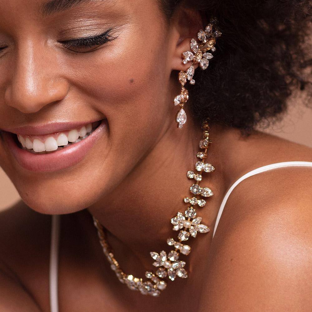 All jewelry is made of brass with 18-karat gold or rhodium plating and selectively chosen high-quality crystals. All jewelry complies with EU standards as nickel-safe/nickel-approved, meaning that the nickel content released is below the allowable threshold (0.05%). Nearly all metals contain some trace amounts of nickel, even if in extremely small quantities. The earring posts we use are made of 925 silver. All materials used in manufacturing are consistently tested for the highest quality.