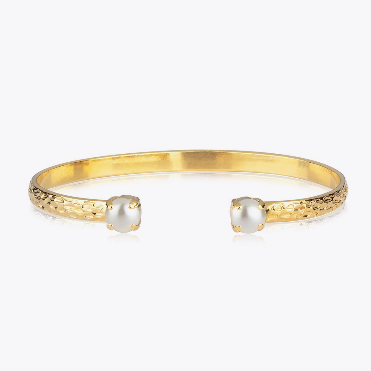 This sleek golden bracelet is beautifully set with round white pearls. The metal has a hammered textured. Adjustable size.
