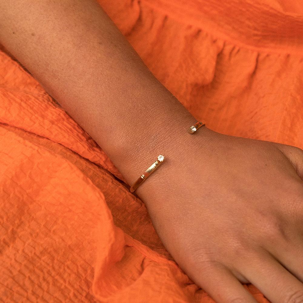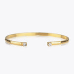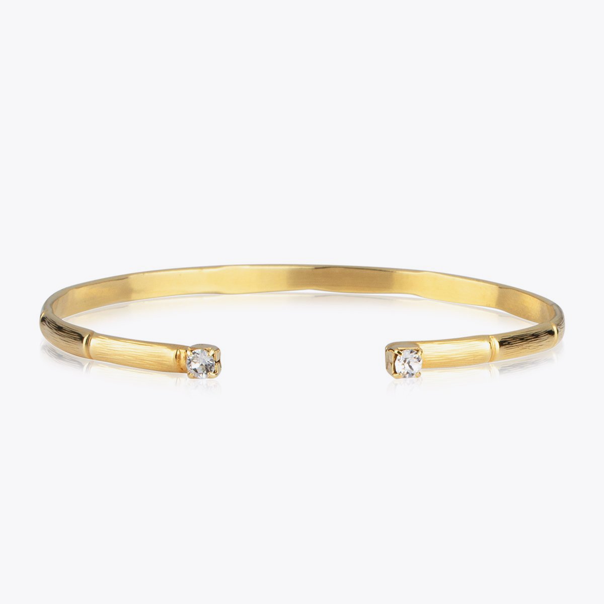 This thin bamboo inspired bracelet with small solitaire crystals on the side has the ultimate simplicity style. Add your favorite bracelets for a personal stacking style or just as it is.