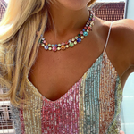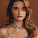 Pomona Necklace reminds us of a beautiful rainbow with its fantastic color combination. The ultimate feminine statement necklace with a playful blend of colorful crystals. The necklace fits perfectly over a large cashmere sweater, under a jacket or with a simple t-shirt.